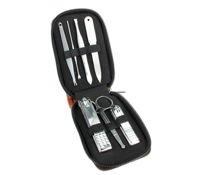 Maniküre Set (7 Teile) 65x110mm aus PU Kunstleder in Laserqualität. Inhalt besteht aus Nagelhautschieber, Pinzette, Feile, Schere, 2x Knipszangen und Ohrenreiniger. Das Laserleder kann mit einem kräftigen schwarzen Kontrast personalisiert werden. Der Artikel ist unbedruckt.